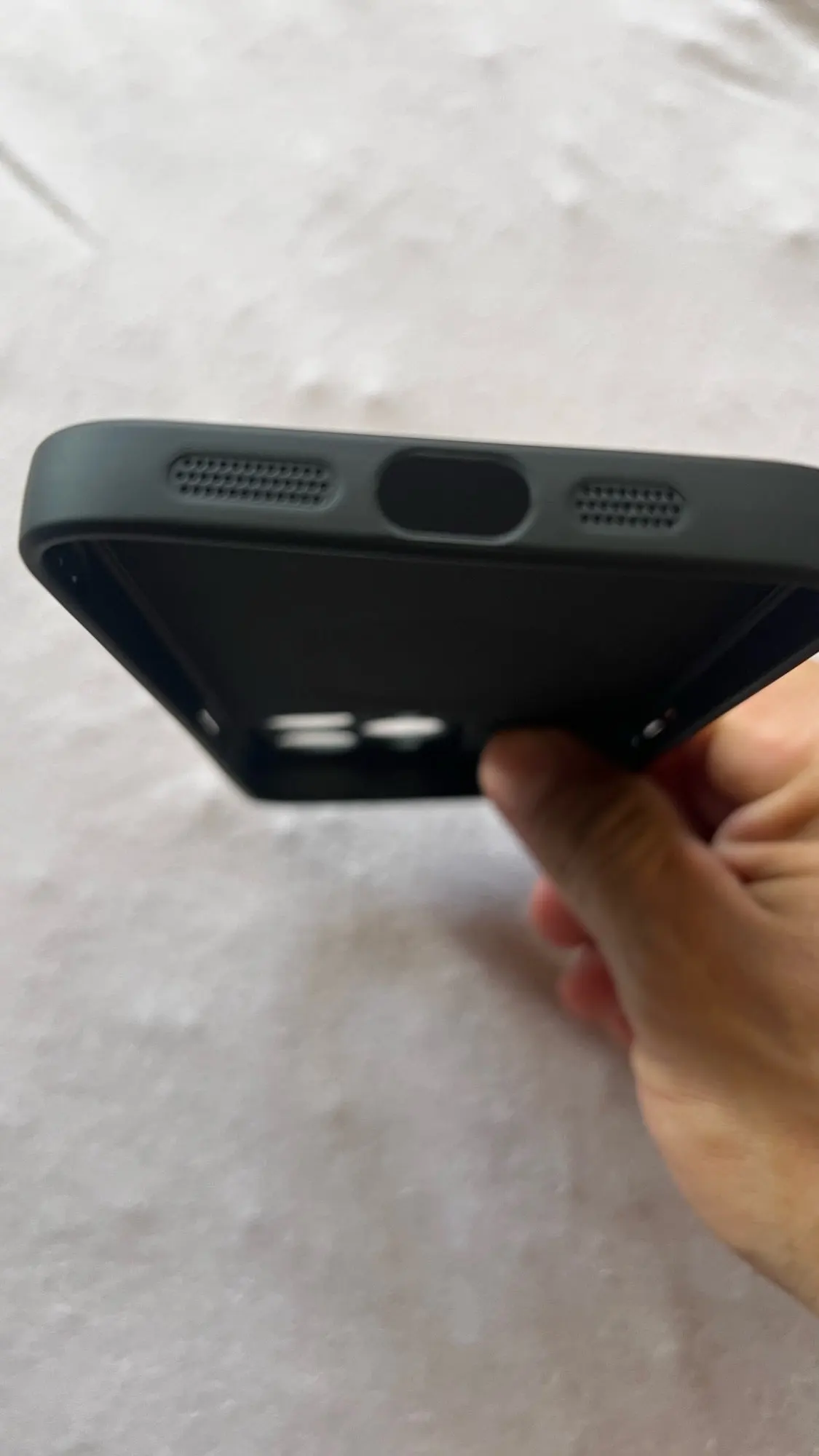 Phone case with anti-fingerprint feature and hand touching it on a pink background
