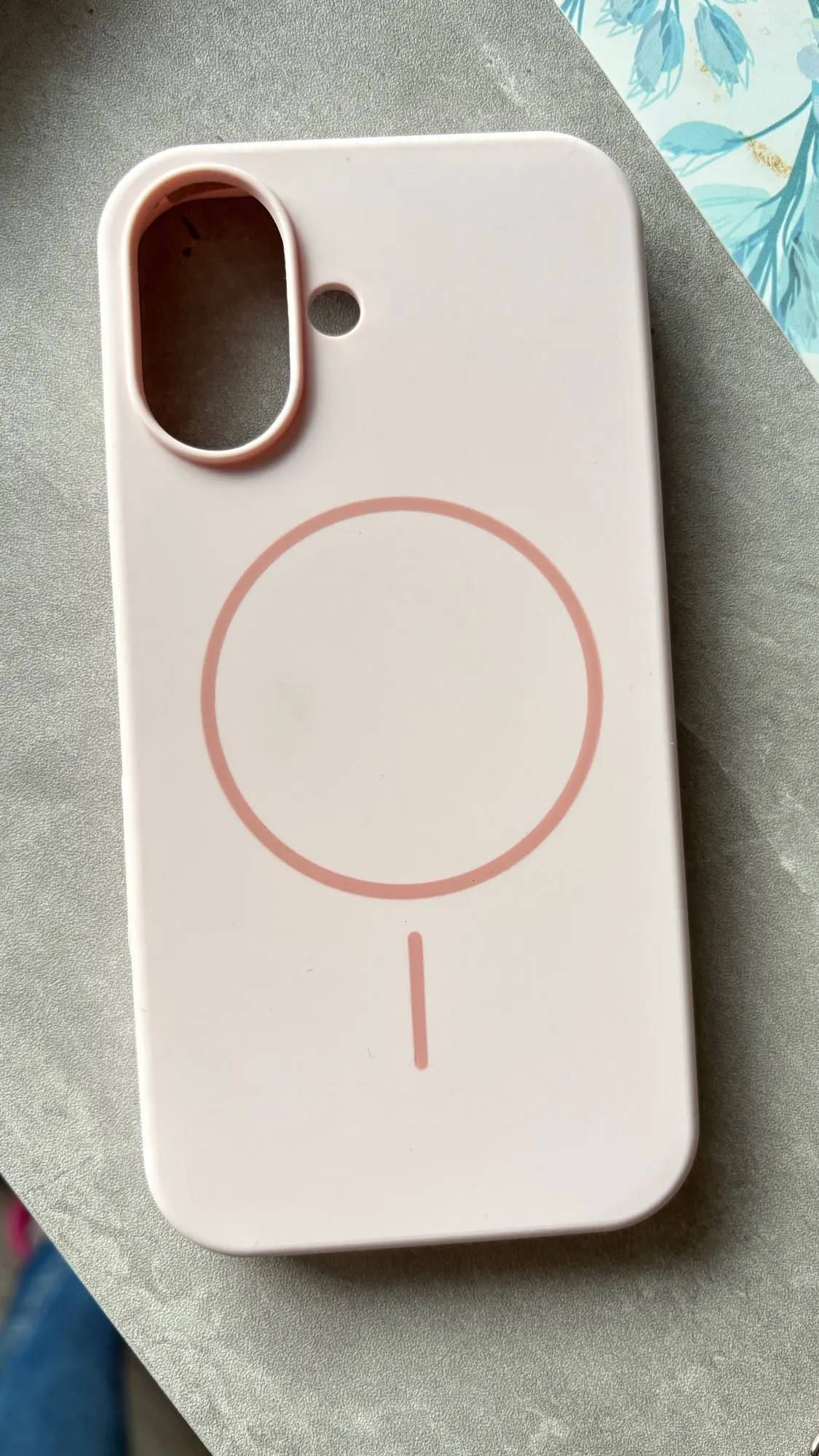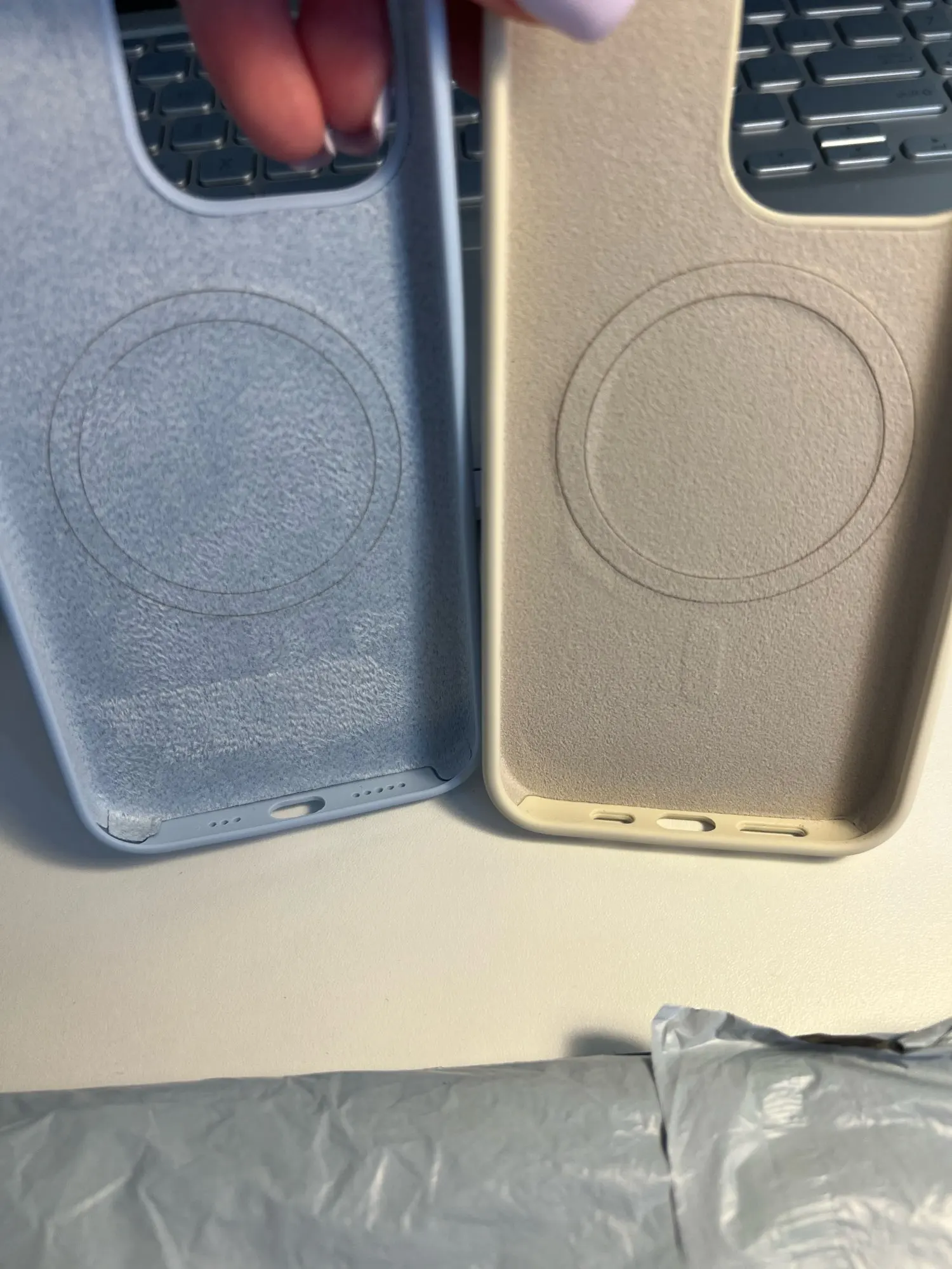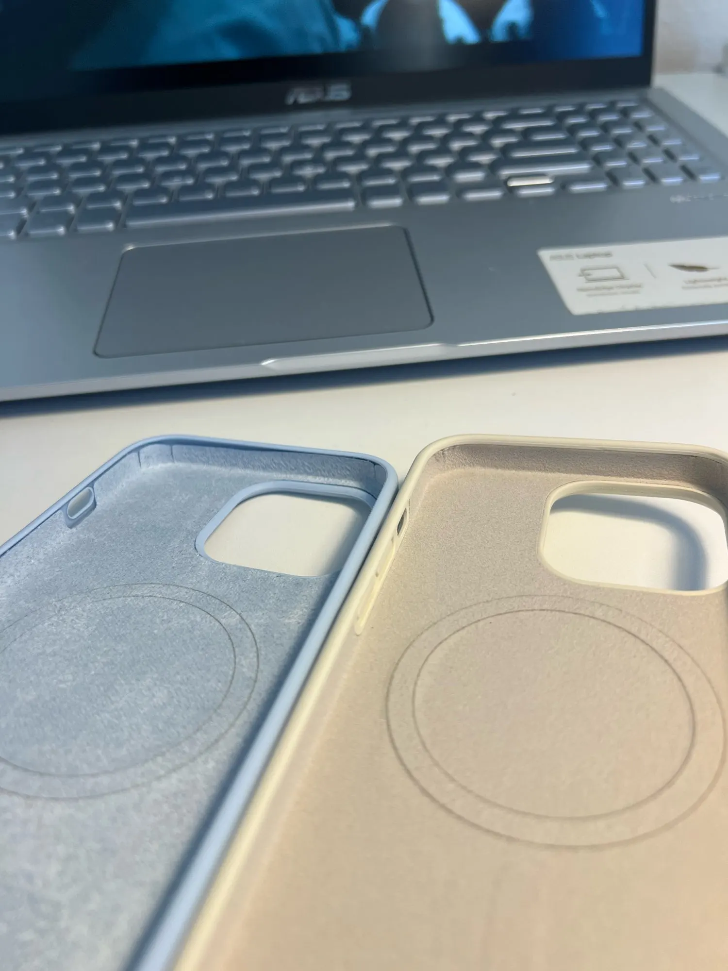 Two liquid silicone iphone cases for Magsafe on a gray background
