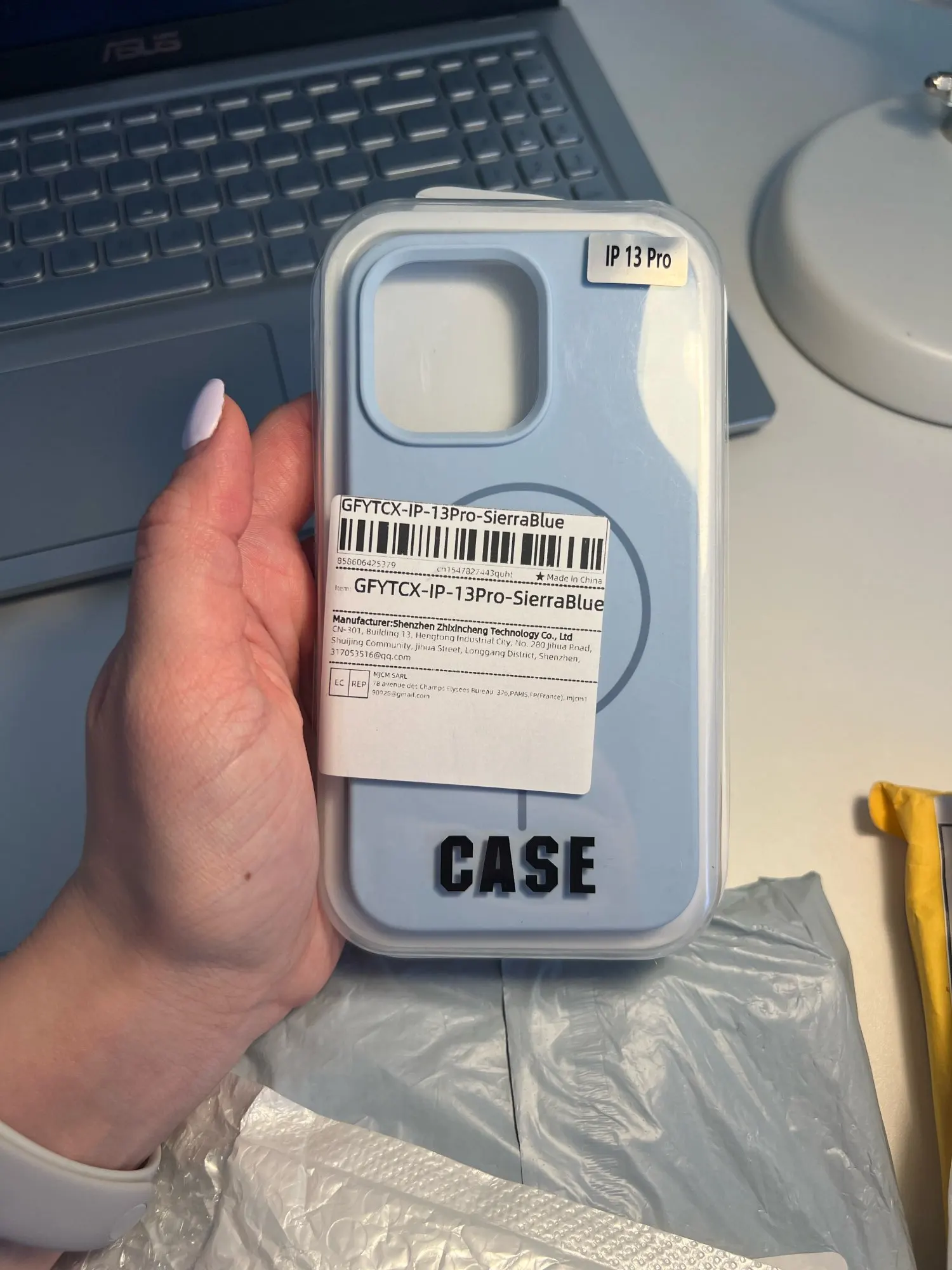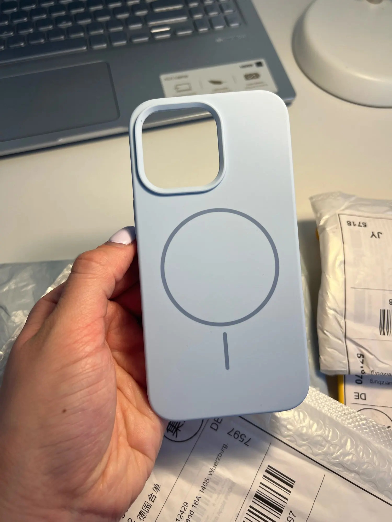 Person holding a blue Luxury Skin Feel Magnetic Magsafe Phone Case for iPhone 12-17 Pro Max Plus Wireless Charger Cover.
