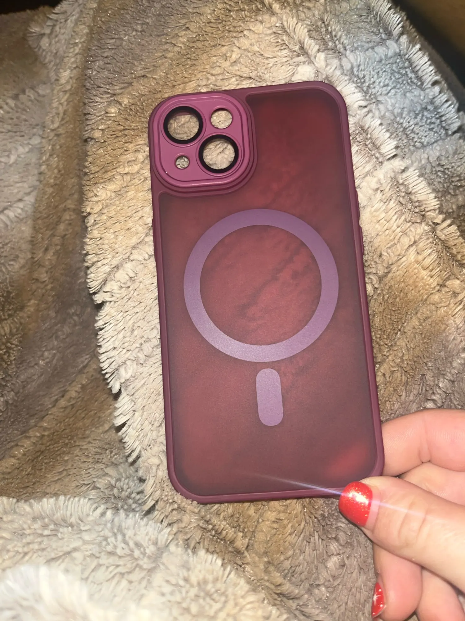 PurpleMatte translucent magnetic iPhone case with camera lens protection and MagSafe held by a hand on a wooden surface