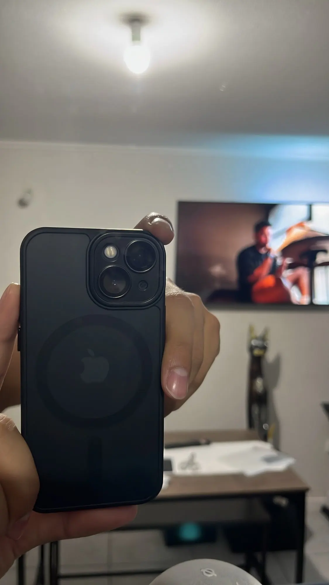 Phone case with camera lens protector held by a hand in an indoor setting
