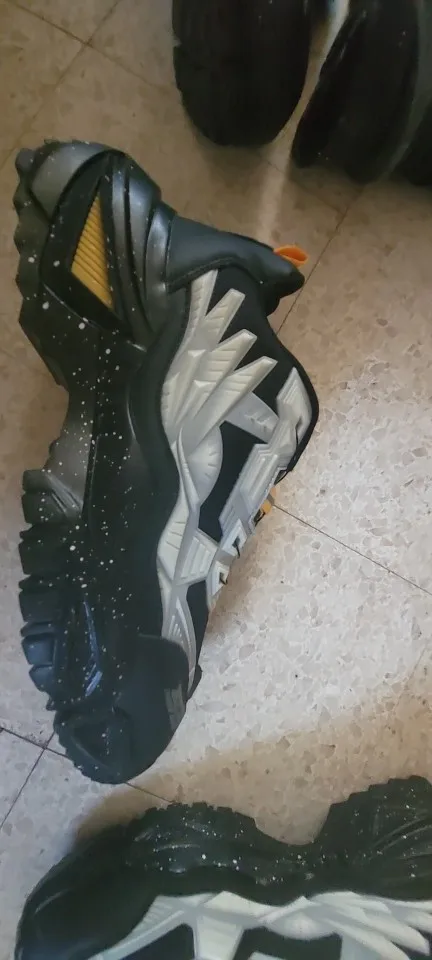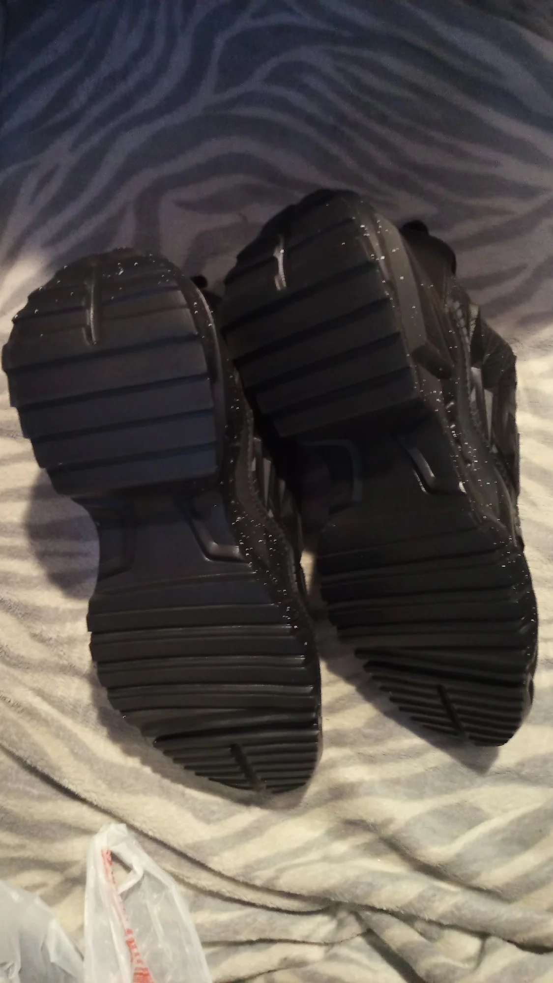 Black athletic shoes with thick soles worn by a person on a blurred background